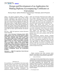 Abstract —The Diploma Supplement (SKPI) is an official document containing information about students’ learning outcomes, competencies, and experiences during their academic journey. Manual SKPI creation often encounters issues such as data entry errors, duplication, and delays. This study aims to design a web-based application to automate the SKPI creation process in higher education institutions. The development method used is Rapid Application Development (RAD), which includes analysis, design, implementation, and testing. The application is developed using PHP, MySQL, and the CodeIgniter framework. Blackbox testing results show the system meets user needs, improves efficiency, and minimizes errors. Keywords — SKPI, Web Application, Academic Information System, RAD, PDF Abstrak —Surat Keterangan Pendamping Ijazah (SKPI) adalah dokumen resmi yang memuat informasi capaian pembelajaran, kompetensi, dan pengalaman mahasiswa selama studi. Pembuatan SKPI secara manual sering menimbulkan kendala seperti kesalahan input, duplikasi, dan keterlambatan. Penelitian ini bertujuan merancang aplikasi berbasis web untuk mengotomatisasi pembuatan SKPI di perguruan tinggi. Metode pengembangan menggunakan Rapid Application Development (RAD) dengan tahapan analisis, perancangan, implementasi, dan pengujian. Aplikasi dikembangkan menggunakan PHP, MySQL, dan framework CodeIgniter. Hasil pengujian blackbox menunjukkan sistem berjalan sesuai kebutuhan pengguna, meningkatkan efisiensi, dan meminimalkan kesalahan. Kata kunci — SKPI, Web Application, Sistem Informasi Akademik, RAD, PDF