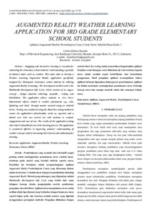 Abstract - Engaging and interactive learning is essential for enhancing the elementary school students’ understanding, especially of abstract topics such as weather. This study aims to develop a Weather Learning Augmented Reality Application specifically designed for third-grade elementary school students by utilizing Augmented Reality technology. The development method used is the Multimedia Development Life Cycle, which consists of six stages: concept , design, material collecting, assembly , testing, and distribution. The application allows students to view threedimensional objects related to weather phenomena e.g., rain, lightning, and cloud through marker scanned using an Android device. Testing was conducted using the black-box testing method to ensure the application's functionality works as expected, and a limited user trial was carried out with students to evaluate engagement and ease of use. The results of the application testing show that it is feasible for use in the learning process. The application is considered effective in improving students’ understanding of weather concept s and in increasing their interest and enthusiasm for learning. Keywords: Application, Augmented Reality, Weather Learning, Elementary School, MDLC. Abstak - Pembelajaran yang menarik dan interaktif sangat penting untuk meningkatkan pemahaman siswa sekolah dasar, terutama pada materi yang bersifat abstrak seperti cuaca. Penelitian ini bertujuan untuk mengembangkan Aplikasi Augmented Reality Pembelajaran Cuaca yang dirancang khusus untuk siswa kelas 3 sekolah dasar dengan memanfaatkan teknologi Augmented Realit. Metode pengembangan yang digunakan adalah Multimedia Development Life Cycle yang terdiri dari enam tahapan: konsep, desain, pengumpulan materi, pembuatan, pengujian, dan distribusi. Aplikasi ini memungkinkan siswa untuk melihat objek tiga dimensi yang berkaitan dengan fenomena cuaca seperti hujan, petir, dan berawan melalui marker yang dipindai menggunakan perangkat Android. Pengujian dilakukan dengan metode black-box testing untuk memastikan fungsionalitas aplikasi berjalan sesuai harapan, serta dilakukan uji coba terbatas kepada siswa untuk menilai aspek keterlibatan dan kemudahan penggunaan. Hasil pengujian aplikasi menunjukkan bahwa aplikasi ini layak digunakan dalam proses pembelajaran. Aplikasi ini dinilai membantu meningkatkan pemahaman siswa terhadap konsep cuaca dan mampu menarik minat dan semangat belajar siswa. Kata kunci: Aplikasi, Augmented Reality, Pembelajaran Cuaca, Sekolah Dasar, MDLC.